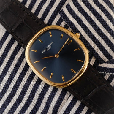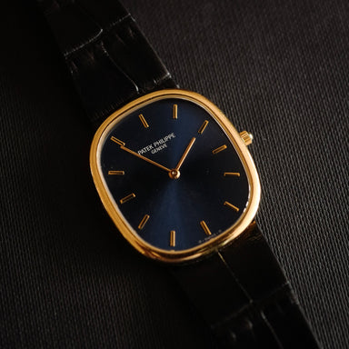 Details Catalogue Essay Maker Bio Manufacturer: Patek PhilippeModel Name: Golden EllipseYear: Circa 1990Reference No: 3738Material: 18K yellow ...